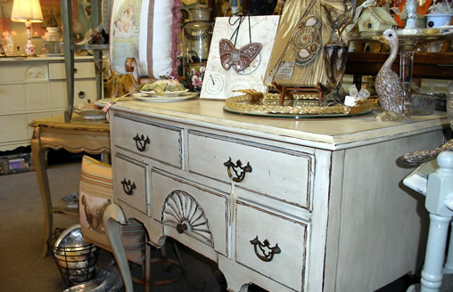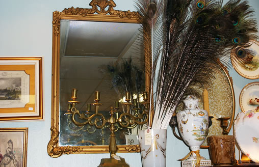 Enjoy the artful vignettes of interesting painted furniture and old gesso mirrors.